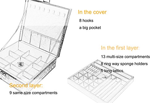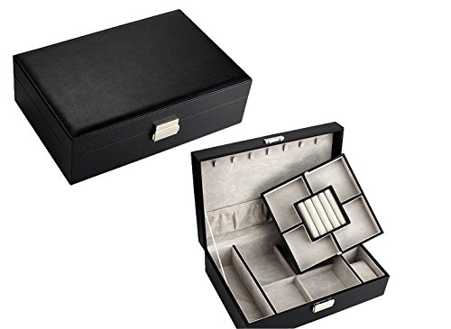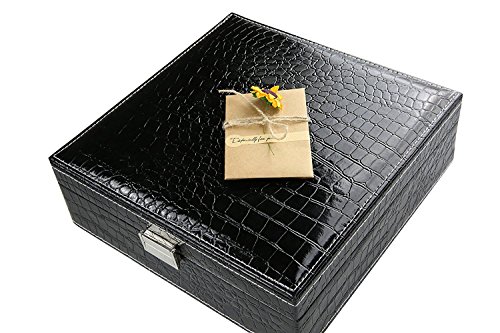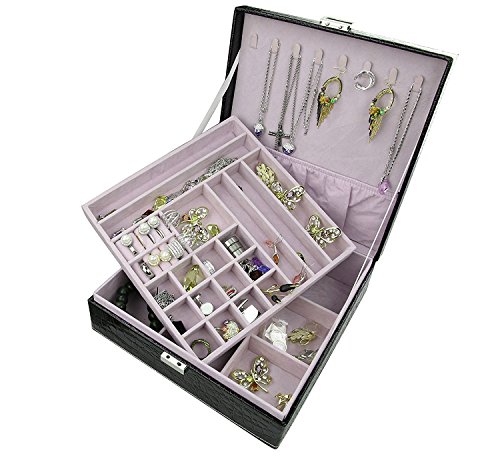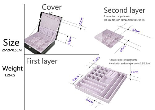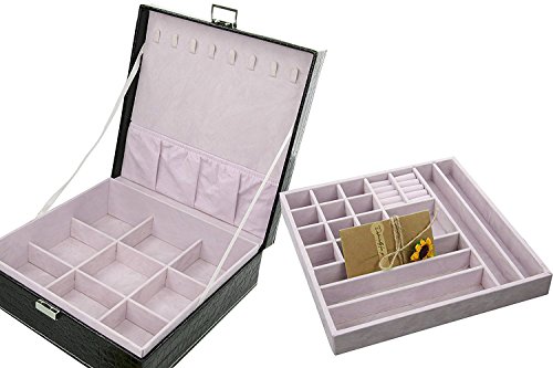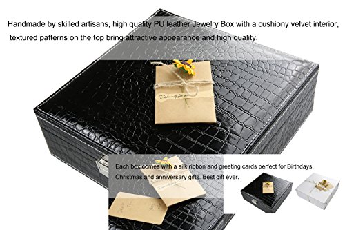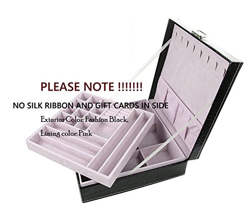 -. Feature : Exterior Color: Fashion Black, Lining color: Lavender / Materials: PU Leather Exterior ,Cushiony Velvet Lining / Handmade by skilled artisans, high quality PU leather Jewelry Box with a cushiony velvet interior, textured patterns on the top bring attractive appearance and high quality. 2、Each box comes with a silk ribbon and greeting cards perfect for Birthdays, Christmas and anniversary gifts. Best gift ever. / The box with large capacity and diversified structures allows you to take your favorite jewelry while going out on vacation with an enormous amount of space and versatility. / With silk ribbon and greeting cards , a Nice little treat for yourself or perfect gift for your loved ones.