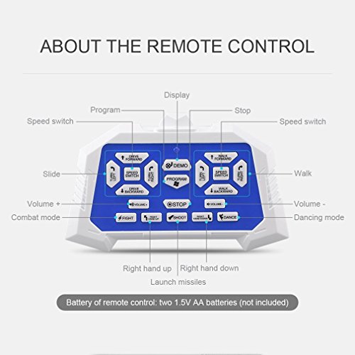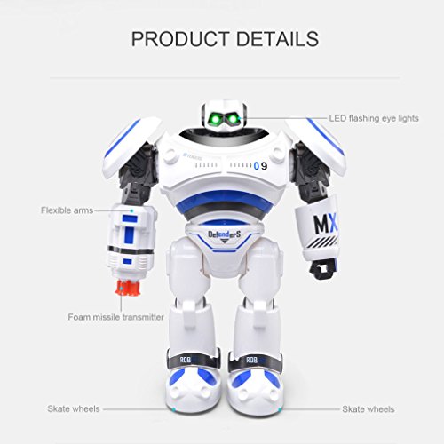 -. Binding : Toy -. Brand : Yongviour -. EAN : 0656804992791 -. Feature : Made from superior material ensure strong shockproof body, durable for long time use. / Walking and Sliding Mode for going forward / backward, turning left / right. / Fighting mode, the missiles can be projected towards various directions in the air. / Auto Demonstration of a series of movements which have been programmed / 4.8V 700mAh NiCd battery offers up to 20 minutes' entertainment each time. -. IsAdultProduct : 0 -. ItemPartNumber : 129098 -. Label : Yongviour -. Manufacturer : Yongviour -. MPN : 129098 -. PackageQuantity : 1 -. PartNumber : 129098 -. ProductGroup : Toy -. ProductTypeName : TOYS_AND_GAMES -. Publisher : Yongviour -. Studio : Yongviour -. Title : Yongvigour RC Robot Intelligent Walking Dancing Combat Defenders Armor Battle Remote Control Robot Toy for Kids Boys -. UPC : 656804992791