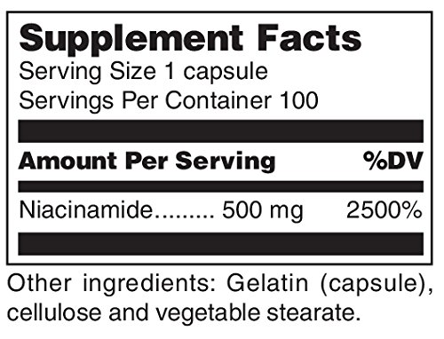 -. Feature : Niacinamide, provided by Douglas Laboratories®, provides 500 mg of niacinamide per capsule / 100 Capsules / As a dietary supplement, adults take one capsule daily with meals or as directed by physician. / * These statements have not been evaluated by the Food and Drug Administration. This product is not intended to diagnose, treat, cure, or prevent any disease.