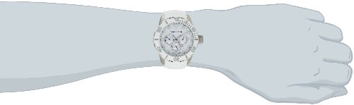 Casual watch, Japanese quartz movement, Multifunction featuring 24-hour, day and date subdials, Matte silver-tone hands with luminous accents and luminescent glossy blue sweep seconds, Glossy blue hands mark subdials, Applied luminescent matte silver-tone triangle marker at twelve o'clock position, Applied luminescent matte silver-tone dot hour markers, Black print, Arabic numbers and indices mark subdials, Black indices form minute track on surrounding concave ring, Two-layered matte white dial with black logo below twelve o'clock position, Matte white silicone strap with embossed logo, ridged texture along edges and brushed silver-tone stainless steel buckle, Matte white resin bezel with engraved grey triangle marker/baton markers/Arabic numbers/indices, Brushed silver-tone stainless steel round case, Textured steel screw-down crown with engraved logo, Stainless steel screw-down caseback, Mineral crystal, 10 ATM (100 meters/330 feet water resistant)Feature