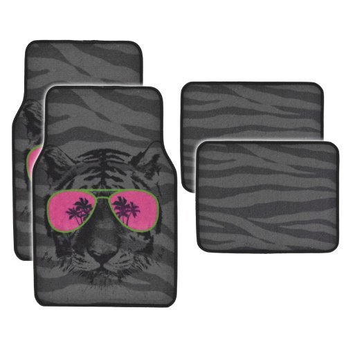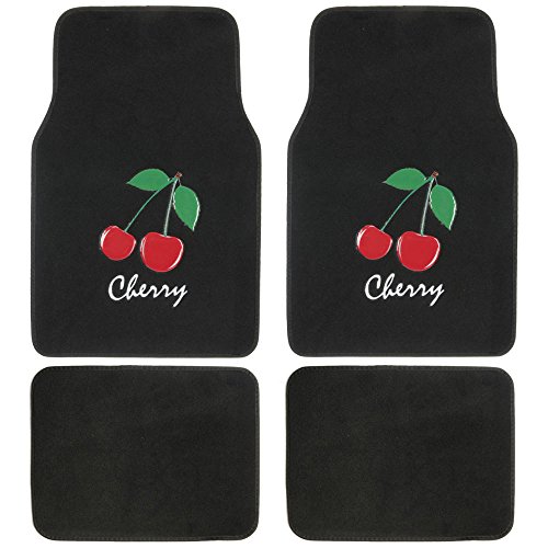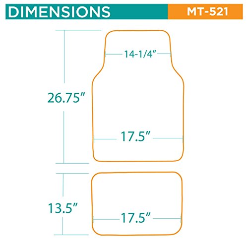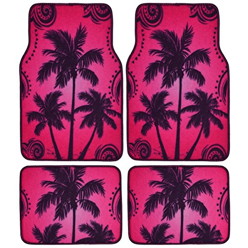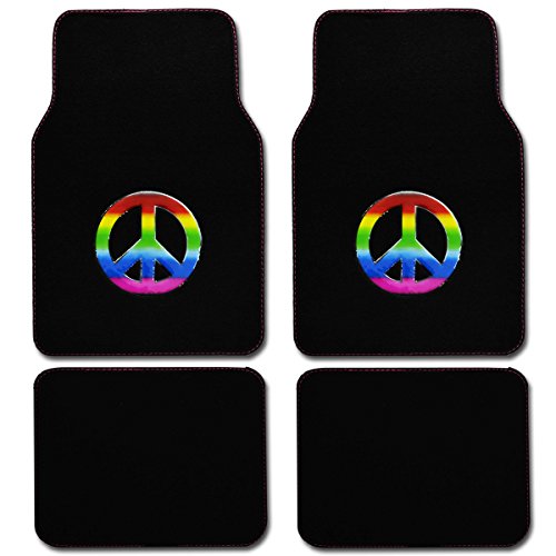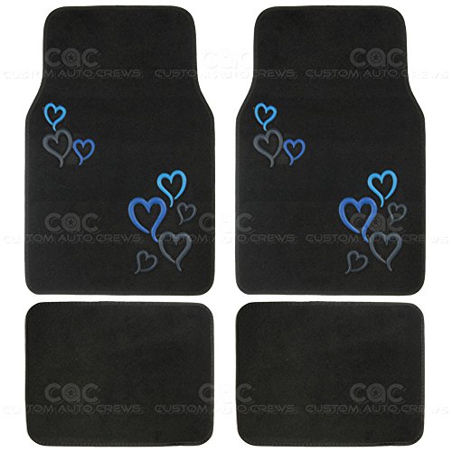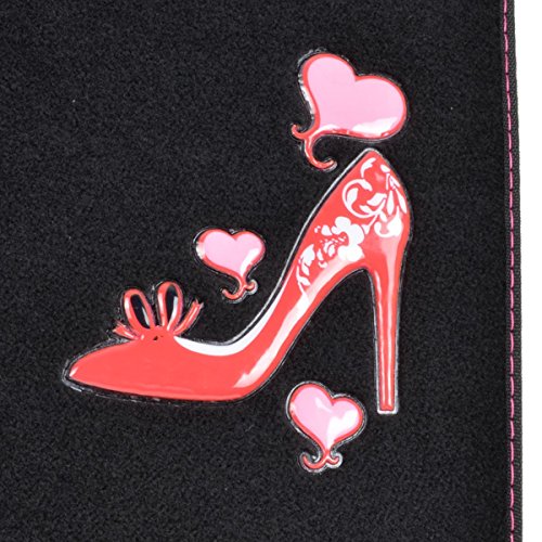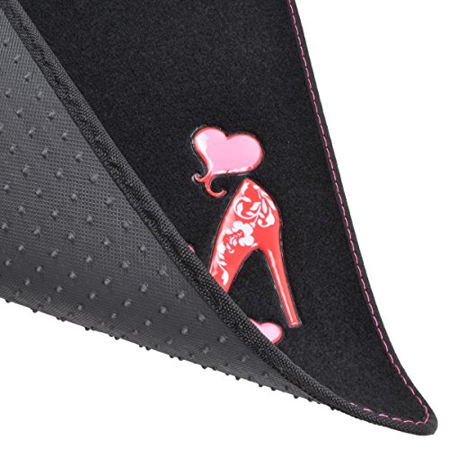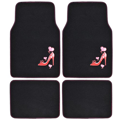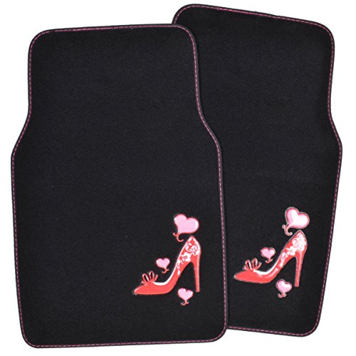 Drive in style with a set of anti-fade coloring love heel floor mats. Quality nylon carpet with scratch resistant TPR patch color design. Protects vehicle's carpet against spills, stains, dirt and any debris. Non-Skid nib backing keep floor mats in place. Universal shape to fit most cars, SUVs, trucks and vans set includes 2 front mats (27x17 inch.), 2 back mats (17x13 inches).