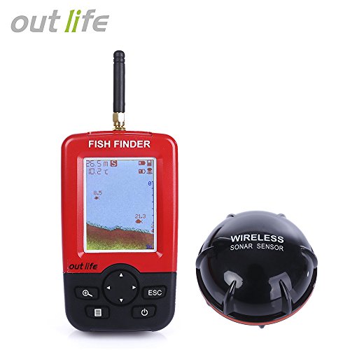 OUTLIFE Fish Finder - Wireless Sonar Sensor and Handheld LCD Display Monitor with Depth / Water Temperature / Fish Size / Location, for Small Boats Ice Lake Sea Night Fishing