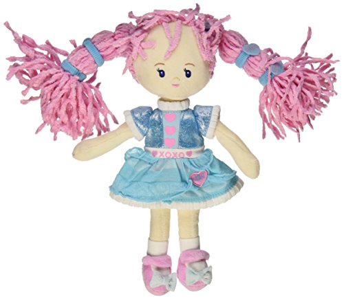 - Dressed in a blue dress with pink heart accents.