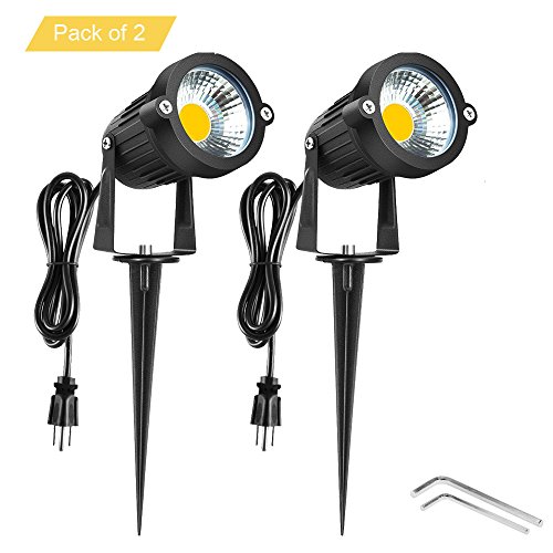 Onerbuy Bright Outdoor LED Landscape Lighting 5W COB Decorative Garden Wall Yard Path Lawn Light Lamp with Spiked Stand and Power Plug, Pack of 2 (Warm White)