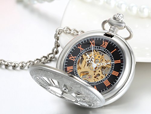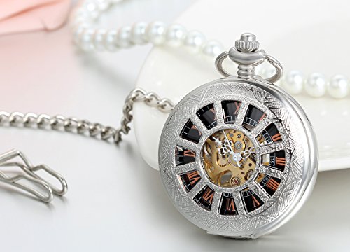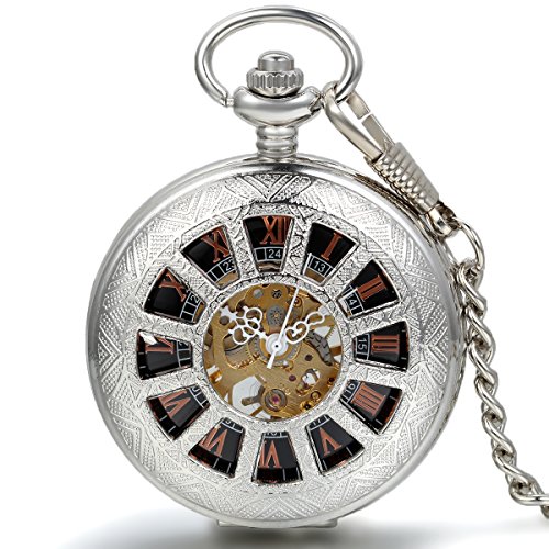 -. Title : JewelryWe Deluxe Wheel Style Pocket Watch, Mechanical Movement Hand Wind Pocket Watch, Half Hunter Watch with Chain