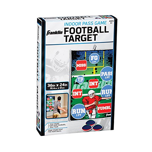 Franklin sports football target indoor pass game fits on most doors and includes 1 door hook and 3 self stick footballs. Great indoor fun for ages 7 and up.