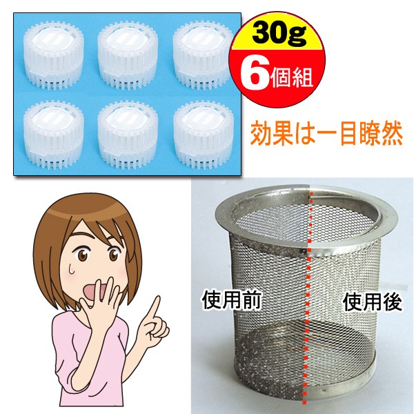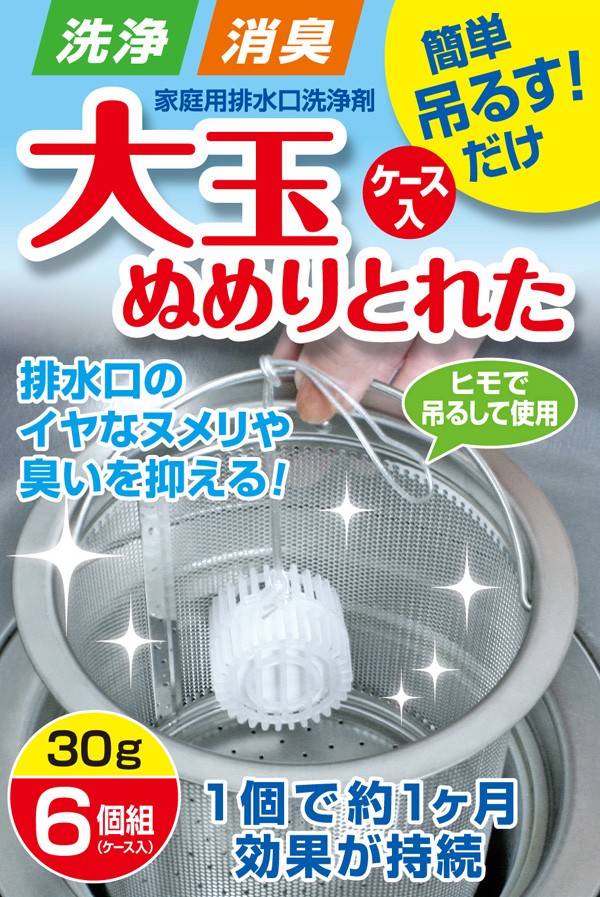 キッチンの排水口ストレーナーに吊るすだけで約一月間、ヌメリやニオイが抑えられる大粒タイプの家庭用排水口洗浄剤です。キッチンの流し台にはさまざまな雑菌が繁殖します。排水口ストレーナーにはそんなバイ菌が溜まり込んで、イヤ~なヌメリや悪臭が発生します。本品は、ストレーナーに吊るしておくだけでしっかりと抑制。1個で1ヶ月間使用できるので、6個で約半年間はヌメリとおさらばです。