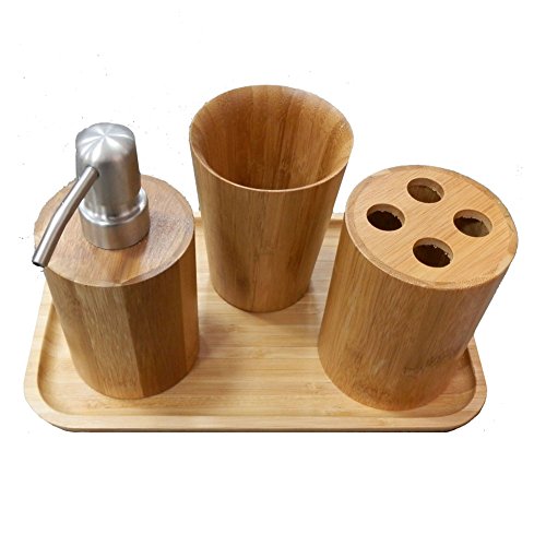 -. Feature : Elegant five in one bath accessory set. / Renewable bamboo in a natural finish. / Consists of 1 soap lotion dispenser, 1 tootbrush holder, 1 cup , 1 soap dish and 1 stylish multi-purpose tray. / Organizes and maximises use of counter space. / Wonderful functional accessory for any bathroom.