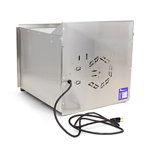 800 watt heating element and fan creates horizontal air flow. Maintains even dehydrating temperatures Adjustable thermostat; temperature range from 90º - 165ºF