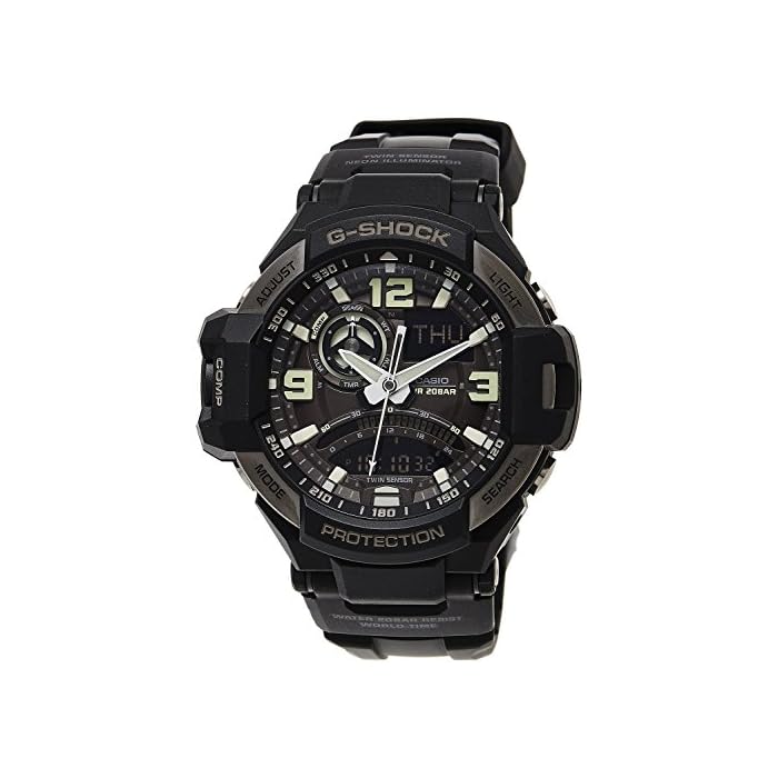 Movement: Quartz Case size (approximately): width) 52mm × (thickness) 16mm Waterproof performance: for everyday life strengthen waterproof (20 atm) impact structure, full auto calendar, digital compass, temperature measurement function, alarm, world time, stopwatch, incorporating the opinion of the timer pilot, a full-fledged aviation BR "SKY cOCKPIT (Sky cockpit)" having a function as a watch New models emerge of. For BR pilot, evolution in terms of both function and design. Commitment to visibility in BR terms of design, adopted the easy-to-read face design information. BR BR ● Quartz BR ● Shock structure BR ● 20 water pressure BR ● orientation measurement function BR ● temperature measurement function BR ● World Time BR ● stopwatch BR ● timer BR ● time alarm BR ● Full automatic BR ● neon Illuminator BR ● size (HxWxD): about 51 × 52 × 17mm BR ● weight: about 85g BR arms around: up to approximately 21cm BR ● BR ● instruction manual with G-shock case (Japanese copy supplied for the foreign language notation) BR ● peace of mind in the case of one-year guarantee BR ※ formula, exchange thank you in your BR BR
