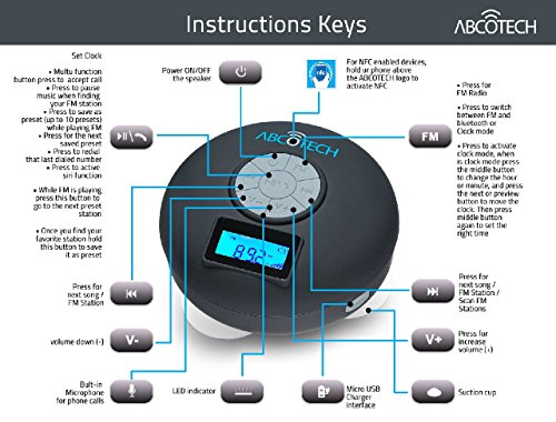 Feature : LCD SCREEN Yes we heared your complianst from our old version that you can't see which station is playing so we upgraded to a speaker with a LCD displays Screen, Where you can see the time and the Radio station that is currently playing, making it a lot faster to find your station. You didn't see this coming right.? / FM RADIO - PRESETS: We have updated our Speaker with this amazing feature - Preset your favorite stations and listen to them every time with this updated shower speaker up to 10 stations - Listen to your favorite stations 88.0 -108.0MHz - Easily switch between stations with the rewind and fast forward buttons. / NFC - BLUETOOTH: pairs with any Bluetooth or NFC capable device - Also good for the new iPhone 6 Smartphone, No need to pair your phone, Use the Upgraded Technology NFC to connect your phone to the Bluetooth Speaker. / LIFETIME GUARANTEED: When you order this Amazing Bluetooth shower speaker you are protected by a lifetime money back guarantee and world class customer service. This means you have nothing to lose and everything to gain. This Bluetooth shower speaker syncs easily and has great, loud, clear sound. It's also the perfect and most affordable gift for yourself, a friend or family member. A truly great addition to your life.