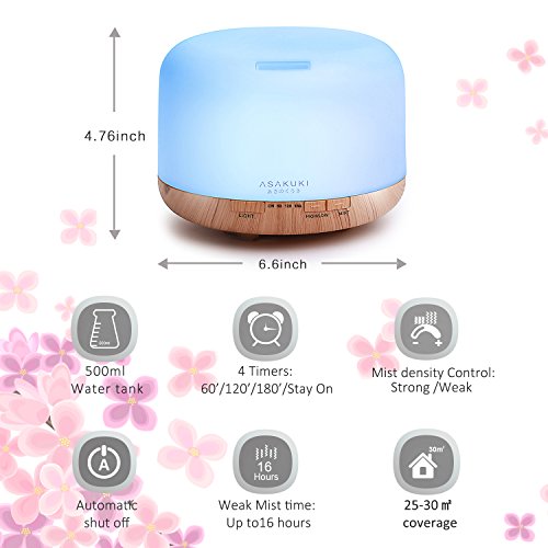 ASAKUKI 500ml Premium, Essential Oil Diffuser, 5 In 1 Ultrasonic Aromatherapy Fragrant Oil Vaporizer Humidifier, Timer and Auto-Off Safety Switch, 7...