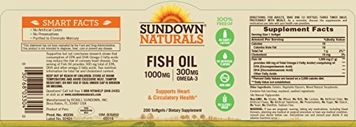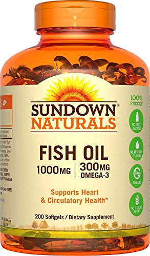 Sundown Naturals Fish Oil 1000 mg provides you with eicosapentaenoic acid (EPA) and docosahexaenoic acid (DHA), two fatty acids that are known for their ability to support healthy heart and cardiovascular function. Fish Oil also contributes to healthy circulation, and helps maintain healthy triglyceride levels already within a normal range. This Fish Oil supplement is purified to eliminate heavy metal contaminants such as mercury and supplies 300 mg of Omega-3s per softgel.Feature