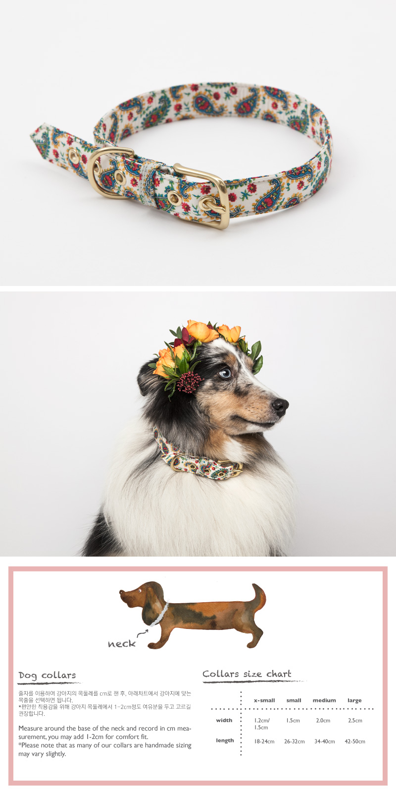 | 화려한 색감과 아름다운 무늬가 돋보이는 플로럴 컬렉션의 목줄로 강아지와 즐겁고 활기찬 하루를 보내세요. 독특한 색감과 무늬를 자랑하며 Art fabric으로 불리우는 영국 리버티 원단을 사용합니다. 미국에서 수입한 신주(solid brass)로 만들어진 금속을 사용합니다. 사람손에 가공되어지는 금속은 매우 견고하며 본연의 색이 아름답습니다. 또한 특허 기술로 오랜시간 녹이 슬지 않아 강아지들에게 더욱 안전합니다. Beautiful floral P.R.Inted fabric collars will make your dog have the best day ever! Liberty fabric from London 100% Cotton Solid brass hardware designed in U.S.A |