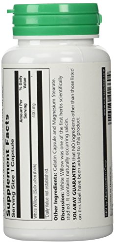 -. Binding : Health and Beauty -. Brand : Solaray -. Department : Herbs -. EAN : 0076280016604 -. Feature : Can be used to relieve common aches and pains as well as chronic pain / Naturally contains salicin, a chemical used to make aspirin / Benefits of a pain-free day without any extra ingredients -. IsAdultProduct : 0 -. Label : Solaray -. LegalDisclaimer : These statements have not been evaluated by the Food & Drug Administration. This products is not intended to diagnose, cure, mitigate, treat, or prevent any disease. -. Manufacturer : Solaray -. Model : 0 -. MPN : 076280016604 -. NumberOfItems : 1 -. PackageQuantity : 1 -. PartNumber : 076280016604 -. ProductGroup : Health and Beauty -. ProductTypeName : HEALTH_PERSONAL_CARE -. PublicationDate : 2014-10-04 -. Publisher : Solaray -. ReleaseDate : 2015-03-19 -. Size : 100 capsules -. Studio : Solaray -. Title : Solaray White Willow Bark Capsules, 400 mg, 100 Count -. UPC : 076280016604