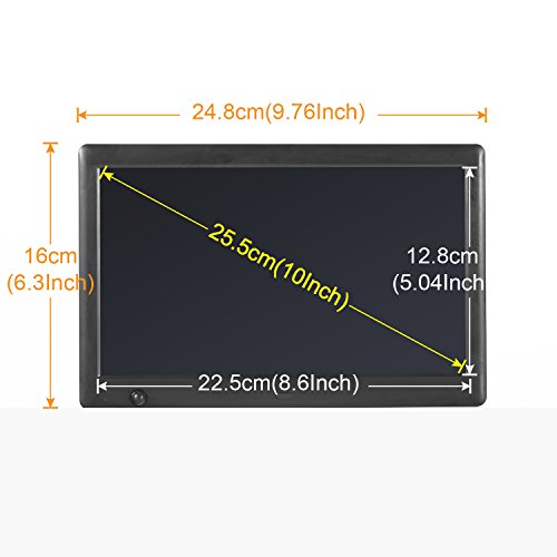 Specifications Color Material: Black ABS frame with IPS screen Product Dimension: 9.76*0.98*6.3" Package Dimension: 11.8*2.55*9.8" Screen diagonal dimension : 10" Power adapter Length: 59" Input: DC 5V Resolution:1024*600