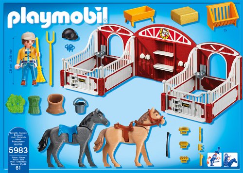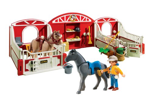 -. Feature : Take care of your horses and give them the perfect home with the County Pony Stable / Playmobil is the largest toy manufacturer in Germany / Figures can bend, sit, stand and turn their heads / Encourages children to explore and learn while having fun / Includes figure, two horses, two stables with nameplates, grooming brushes, hay bales, broom, riding helmet, riding crop, & saddles