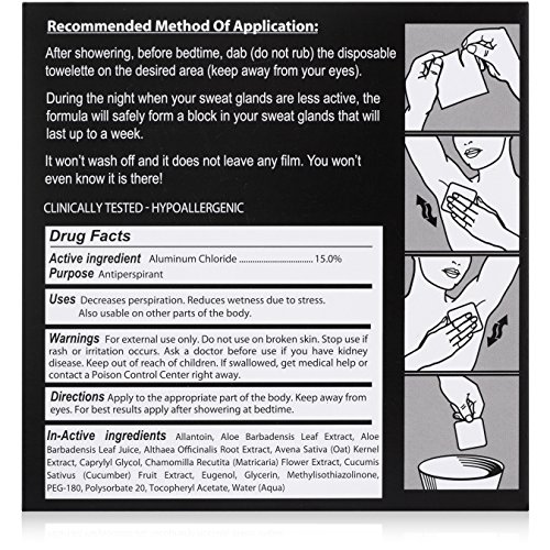Allow your underarms or skin to air dry for a few minutes, and then go to bed. During the night when your sweat glands are less active, Ultra Sweat Shield® will safely form a block in your sweat glands that will last up to a week.