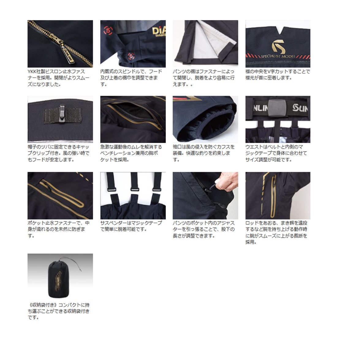 It is a shape memory breathable waterproof waterproof all weather suit that adopted a highly functional material "Diaplex" which adjusts the permeation amount of water vapor by the change of the outside air temperature and the inside clothes temperature.