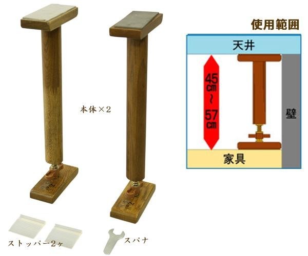 | 家具の横すべりを抑えるストッパーがセットになった転倒防止器具です。野球のバットや高級内装材として使われているタモ集成材を使用しており、家具・室内のインテリアに調和します。 |
