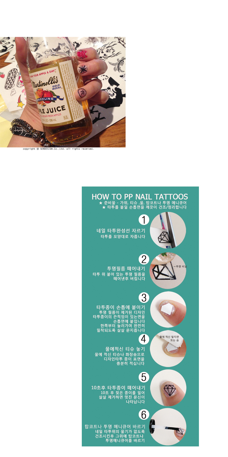 네일타투를 하신후 탑코트나 투명 메니큐어를 발라 주시면 지속기간이 길어집니다