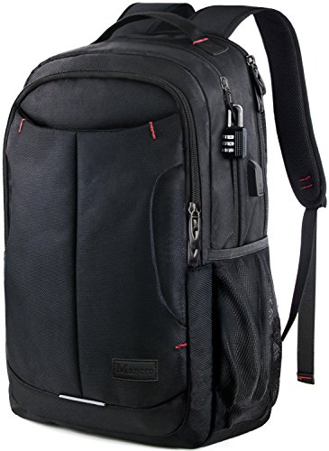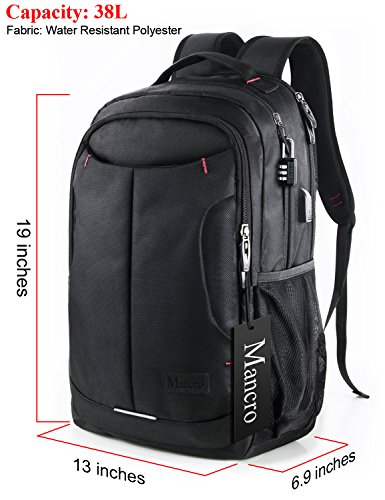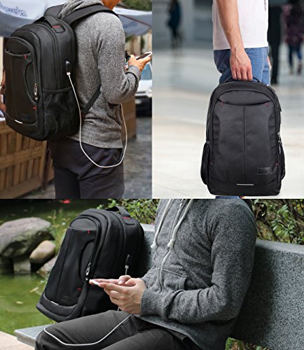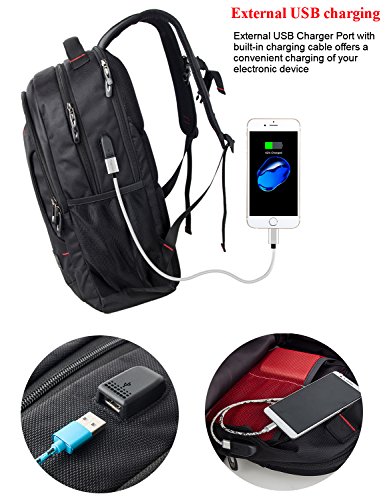 Separate thick padded laptop compartment Offer a compartment designed specifically for your laptop, thick padded adds protection for your laptop External USB Interface External USB with built-in charging cable offers a convenient charging of your electronic device anywhere,perfectly for commuting or traveling 10 Compartments 4 Main Compartments 9 inner small pockets provide divider pockets for your laptop,iPhone, iPad, passport, pen, wallet, 4A file, books, clothes etc..Elasticized mesh side dual pockets expands to secure various size water bottles. Front zippered pocket perfect for storing anything for easy access. Include removable key ring to keep track of your keychain Durability Made of water resistant and anti-scratch double-pile 1680D polyester with high density nylon lining. Abrasion Resistant Dual-Zippers ensure extra strength reliability Comfortable Padded Straps and back Ergonomic Design "S" Curve padded shoulder straps and back multi-panel breathable airflow Ergonomic design offer maximum back support and comfort; top loop handle ensure a secure hold when picking up or moving the backpack. Adjustable chest strap Keeps shoulder straps securely in place and gives your hands free