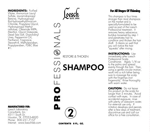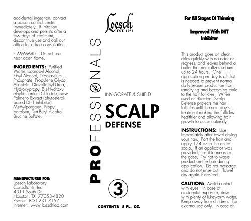 -. Feature : Professional strength products are more concentrated, deeper-penetrating, and longer-lasting in easy and short process, please use Original or Naturals series for dry scalp condition. / Soften and loosen sebum buildup, safely and gently cleanse the follicles, and protect all day against sebum by-products. / Begin with?Loesch Penetrate & Prepare Scalp Conditioner?and?Loesch Restore & Thicken Shampoo?in the shower and then?Loesch Invigorate & Shield Scalp Defense?after towel-drying / Hair growth is a long term process, so use continuously to maintain healthy scalp, prevent hair loss, and foster hair growth and regrowth. / Bio-Med & Pharm is an OEM cosmetics and OTC drugs manufacturer since 1974, with Loesch products since 1951, FDA registered, wholesale available, made in USA. Ship to Continental US 48 states only by Fedex Ground.