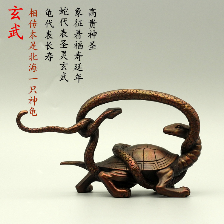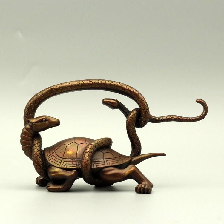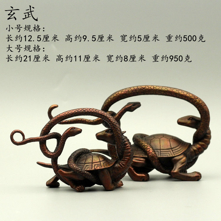 玄武 长约21厘米 高约11厘米 宽约8厘米 重约950克 从制模焙烧到精铸打磨等多达60道工序精心打造,纯手工完成,可摆放在书房,客厅,办公室等场所。
