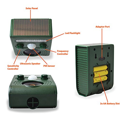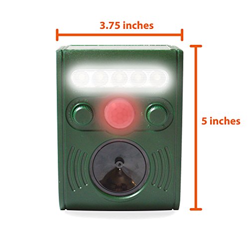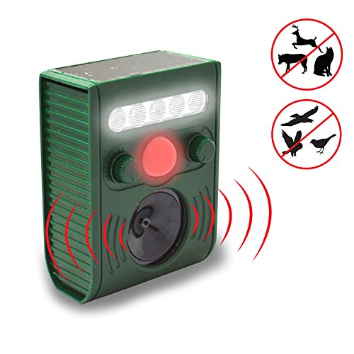 The Solar Powered Ultrasonic Animal and Bird Repeller effectively rids your yard of pests using high-pitched ultrasonic frequencies, which are inaudible to the human ear, but chases away cats, raccoons, skunks, mice and other animals. The best animal control and pest control device, Cat Repellent, Dog Repellent, Deer Repellent, Mice Repellent, Bird Repellent. The repeller is also equipped with a strong LED light to scare away the animals, especially effective for night-time animals. The Solar Powered Ultrasonic Animal and Bird Repeller will not physically harm these pests, simply make them feel uncomfortable.