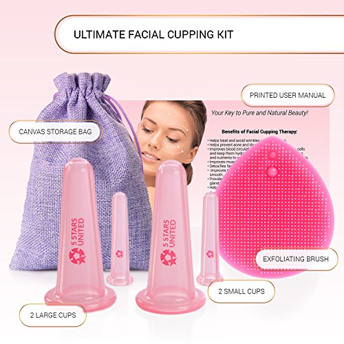 ULTIMATE KIT- This cupping set is all you need to start your therapy. It includes 2 LARGE CUPS for face, neck and décolletage, 2 SMALL CUPS for under-eye area, lips and nasolabial fold. Also as a BONUS you will receive an EXFOLIATING FACIAL BRUSH which can be used daily for deep cleansing. The canvas drawstring bag will keep it all nice and tidy.