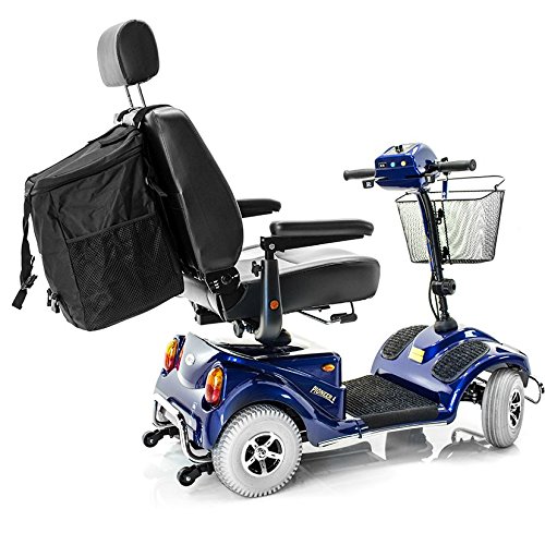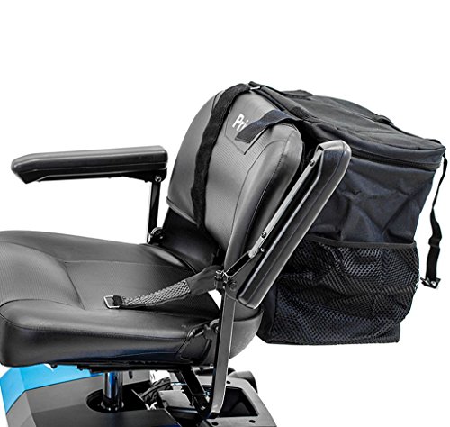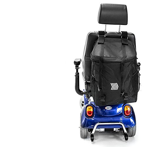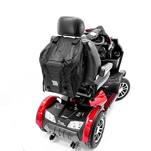 The MEGA backrest Bag J840 has a massive storage space that can carry just about anything! The main compartment includes a full-size zippered loading opening located at the top - large enough to carry probably all your grocery, laundry or personal items. Additionally, it comes with two easy-access side mesh pouches perfect for maps, newspapers or large bottles. The Mega Bag attaches with two Velcro adjustable straps, to the backrest of your scooter or power chair, with minimal effort allowing you to install and remove the bag very quickly. The Mega Bag is made from durable water resistant material. The Mega backrest bag is specifically engineered to work with many scooters and power chairs which are available on the USA market today.Feature