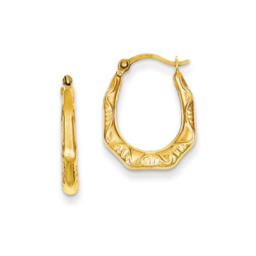Geometric style, these polished 14k yellow gold hoops finished with a hinged post feature a hollow, patterned design and measures approximately 13 x 17mm (1/2 inch x 5/8 inch).