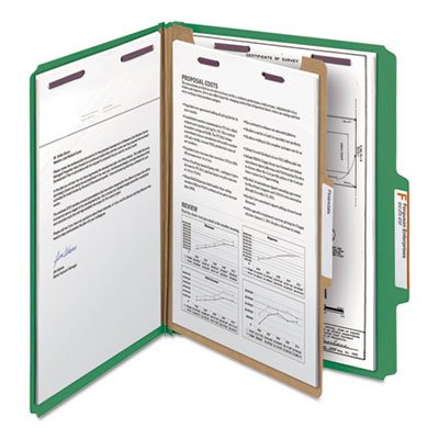 -. Binding : Office Product -. Brand : Smead -. Color : Green -. Feature : Four-section classification folders feature colored 23 pt. pressboard covers with 2'' prong fasteners inside front and back, 1'' capacity fasteners on both sides of 17 pt. brown Kraft dividers, matching color Tyvek® gussets for 2'' expansion and 2/5 cut top tabs in right of center position. / The ultimate classification folder when safety and security are most important. / SafeSHIELD® bonded fasteners add protection for papers and fingers, while also reducing fastener crinkling. / Made of pressboard for extra durability. / Variety of colors for color-coding projects. -. Label : SMEAD MANUFACTURING CO. -. Manufacturer : SMEAD MANUFACTURING CO. -. MPN : 13733 -. PackageQuantity : 1 -. PartNumber : 13733 -. ProductGroup : Office Product -. ProductTypeName : OFFICE_PRODUCTS -. Publisher : SMEAD MANUFACTURING CO. -. SKU : SMD13733-SP0912NU -. Studio : SMEAD MANUFACTURING CO. -. Title : Smead SafeSHIELD Colored Classification Folder - Letter - 8.5" x 11" - 2/5 Cut Tab on Right of Center - 1 Divider - 2" Expansion - 2 Fastener - 2" Capacity - 10 / Box - 23pt. - Green