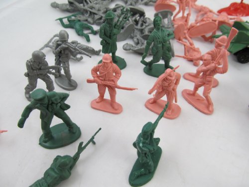 Army Men Playset with 124 pcs. Set includes four flags (Americans, British, Germans, and Japanese), lots of Army men in different colors, loads of vehicles, tanks, jets, planes and more! Nice quality and detail! Great gift for kids! Great Army Men collectible.