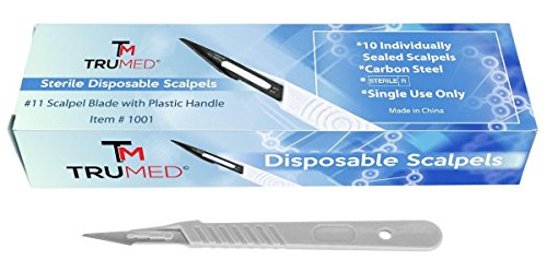 TruMed 1001 Disposable Scalpels with #11 High-Carbon Steel Blades, Plastic Handle, Sterile, Individually Foil Wrapped, Box of 10
