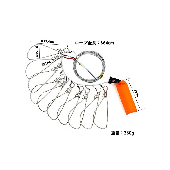 ?여유의 전장 약9m의 와이어와 174㎜의 크 눈(째)의 훅에,폭넓은 어종이나 장소로 대응 가능합니다.훅,와이어 모두 스테인레스제.와이어는 PVC코트필.튼튼하고 유연성이 있어 녹으로도 강한 모아 두고, 안심하고 사용 하실 수 있습니다.