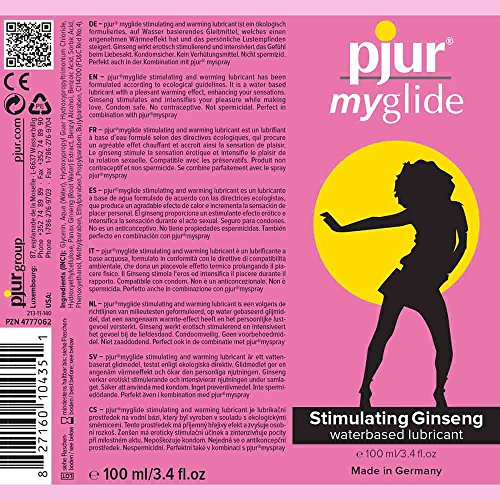 -. Binding : Health and Beauty -. Brand : Pjur -. EAN : 0784922770554 -. Feature : DOUBLE- EFFECT water-based personal lubricant created for women who want an enhanced experience to be even more so. / ENHANCING personal lubricant is hypoallergenic, latex condom safe, and ideal for daily use. / HIGHEST medical grade ingredients and unique formulation make it the slipperiest silicone personal lubricant on the market. / GINSENG provides a natural stimulating and warming effect thus maximizing her sexual experience. / A WATER-BASED personal lubricant for penile and/or vaginal application, intended to moisturize and lubricate, aids in comfort and pleasure of intimate sexual activity and supplement the body's natural lubrication. -. IsAdultProduct : 1 -. Label : Pjur group u.s.a. -. Manufacturer : Pjur group u.s.a. -. Model : 2258332 -. MPN : 2258332 -. NumberOfItems : 1 -. PackageQuantity : 1 -. PartNumber : 2258332 -. ProductGroup : Health and Beauty -. ProductTypeName : HEALTH_PERSONAL_CARE -. Publisher : Pjur group u.s.a. -. SKU : OR06197010000 -. Studio : Pjur group u.s.a. -. Title : Pjur My Glide Stimulating and Warming Lubricant 3.4 Oz -. UPC : 784922505132