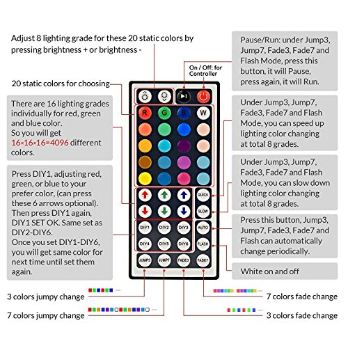 - 6 DIY FUNCTIONS: The led will not dim if you connect them from each output of the IR receiver. 44key controller contains the DIY functions, press DIY button and then just long press one of the arrow button to set it. There are 6 DIY keys, so you can save 6 color you like. They are all independent, have no effect each other.