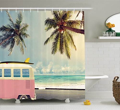 Surf Decor Shower Curtain Set By Ambesonne, Minivan On The Beach Retro Inspired Vocation Theme Clouds In Summer Sky Honeymoon Destination, Bathroom Accessories, 69W X 70L Inches, Multi