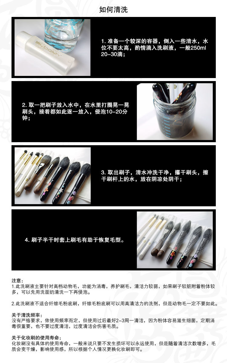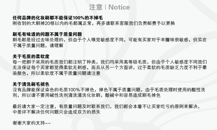 (注意:化妆刷为纯手工制作,所以不能保证每把都完全一样,可能与图片有略微差别,可以接受再购买)怕我们刷子质量不好、怕硬、怕掉毛、怕羊毛味的同学,其实我们的刷子相对价格而言已经是超高性价比了,如果您想省钱还买几百上千元品质的我们真的提供不了,白凤堂那么贵也照样掉毛炸毛,心理预期过高,不满意都不找售后协商就要中差评的兄弟姐妹就别拍了哈,谢过各位!刷子刚出厂,刷杆还有漆味,自然通风晾晒几天就没事了,介意的或者以此为中差评理由的都不要拍!怕我们刷子质量不好、怕硬、怕掉毛、怕羊毛味的同学,其实我们的刷子相对价格而言已经是超高性价比了,如果您想省钱还买几百上千元品质的我们真的提供不了,白凤堂那么贵也照样掉毛炸毛,心理预期过高的请移步实体购物,谢谢啦