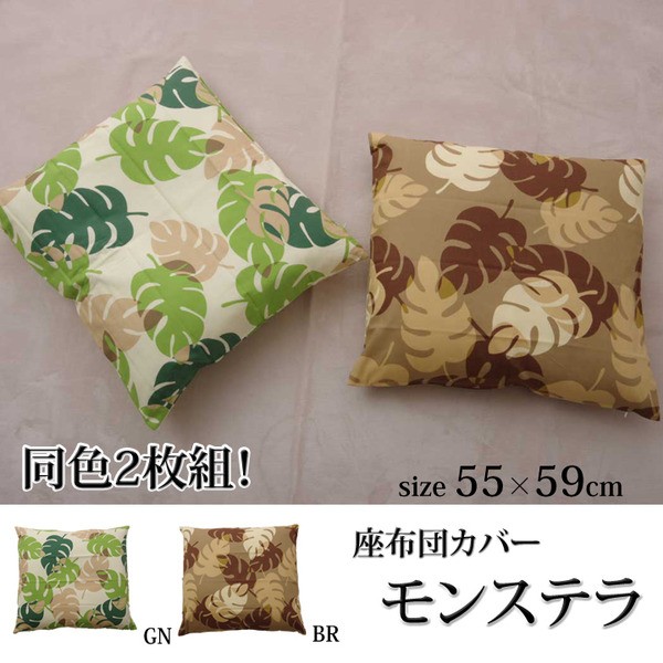 【商品名】クッションカバー 座布団カバー リーフ柄 銘仙判 『モンステラ』 グリーン 約55×59cm 2枚組