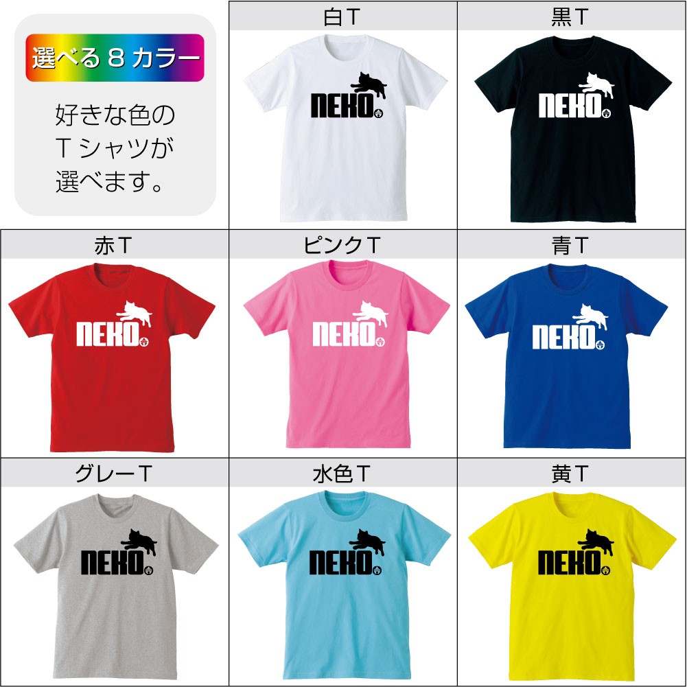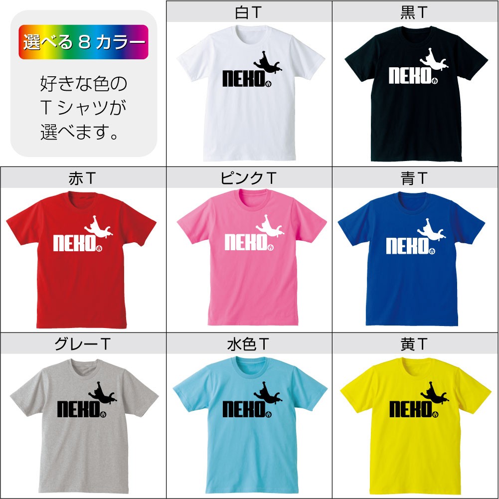 猫好きのためのスポーティロゴTシャツです。ネコシルエットは何だか見たことのスポーツブランドのパロディになってます。猫カフェのみんなでお揃いでどうぞ!Tシャツのカラーは8色から選べるようになりました!サイズはキッズサイズから大人用までございます!親子ペアで着ちゃおう!