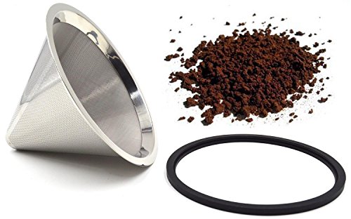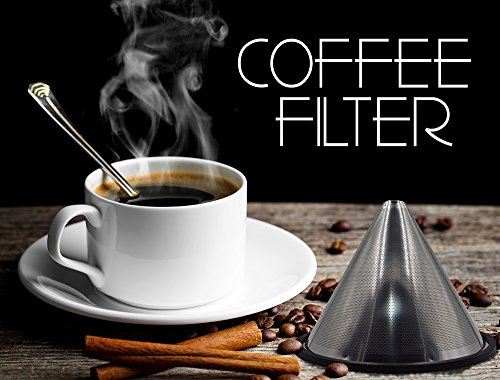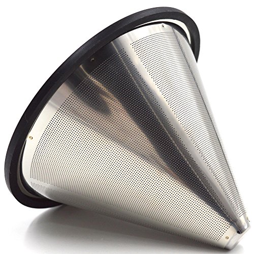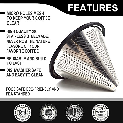 -. Feature : Making coffee like Barista easily - This quality stainless steel cone coffee filter will never rob the oils and essential nutrients of your favorite coffee, allows the nature flavour come out freely. Just need three steps, put your favorite coffee into the cone dripper, place the cone filter in your coffee mugs, pots or carafes, pour the hot water and enjoy your coffee time after 1-3 minutes. / Keep your coffee clear - Double layer filter mesh, both with micro holes, well prevent the coffee grounds and enjoy your favorite coffee freely / Reusable and food safe - The cone coffee steeper is made of 304 (18/8)stainless steel and food grade silicone rim,Build to last, Lead Free, BPA free and FDA standard, totally food safe and eco-friendly / Standard design, fits widely - Special designed to fit your mugs, cups, pots and most popular brand coffee carafes which need a cone filter, including Osaka, Chemex, Hario, Bodum and more / Silicone covered rim, easy to handle - with food grade silicone covered on the rim, it is easy to handle the cone filter even when it is hot, more safe and convenient