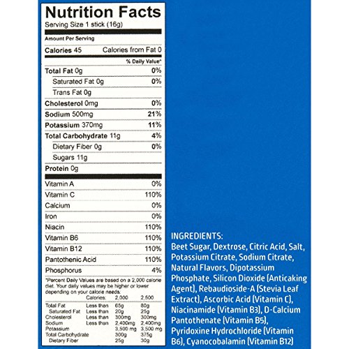 3x electrolytes as leading sports drinks (less than half the sugar and calories). Contains 11 essential minerals and vitamins with more Vitamin C than an orange and more potassium than a banana. 110% Daily Value of Vitamin C, B3, B5, B6, B12.