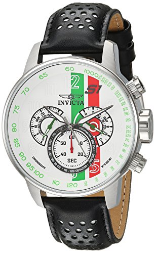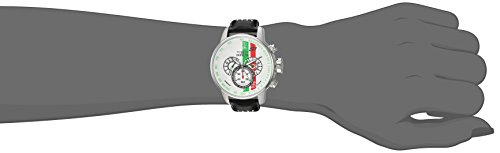 Japanese quartz movement 48mm stainless steel case Black/white leather band Buckle clap closure Green/white/red metal dial Mineral crystal dial window Chronograph pushers Water resistant to 100 meters