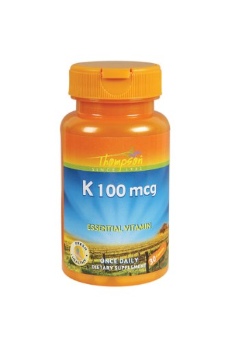 -. Binding : Health and Beauty -. Brand : Thompson -. EAN : 0031315199356 -. Feature : Once daily, 30 gelatin capsules / A member of the Nutraceutical family of brands, Thompson provides quality guaranteed products at an Every Day Value P.R.Ice / Thompson's packaging features highly visible products with their orange bottles, blue/orange labels that are easy to read and easy-to-open lids -. Label : Thompson -. Manufacturer : Thompson -. MPN : 19935 -. NumberOfItems : 6 -. PackageQuantity : 6 -. PartNumber : 19935 -. ProductGroup : Health and Beauty -. ProductTypeName : HEALTH_PERSONAL_CARE -. PublicationDate : 2010-07-20 -. Publisher : Thompson -. Studio : Thompson -. Title : Thompson Vitamin K, 100 mcg, 30-Count (Pack of 6) -. UPC : 031315199356