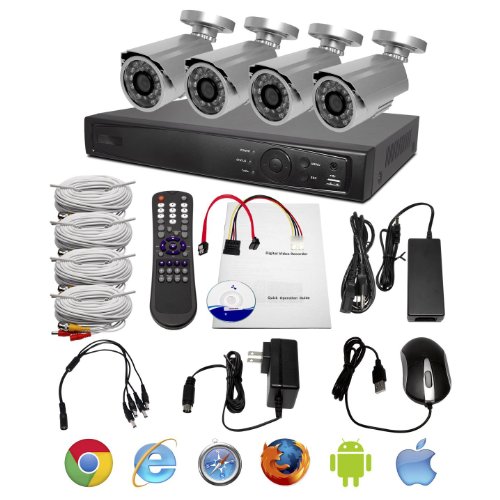 -. Feature : 4 CH Real-time Recording and HD Playback / H.264 Dual-Stream Video Compression / 500GB HDD Included / 4x 520TVL Outdoor/Indoor Cameras / 3.6mm Fixed Lens and 24 IR LEDs up to 50ft Distance