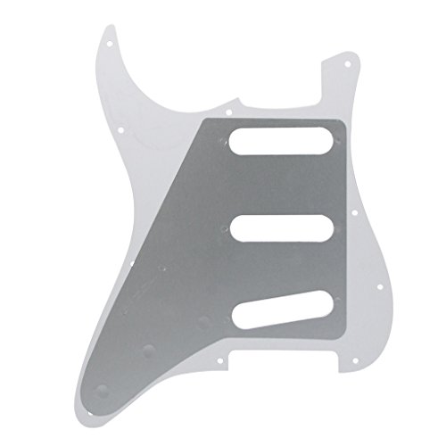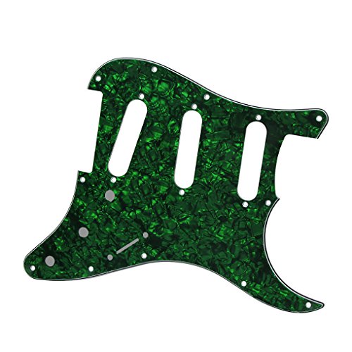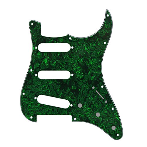 Product Description Feature: * For US Modern Fender Strat Stratocaster style guitar or similar.* With pure aluminum foil shield on the backside, not the common aluminum-foil paper on the market, better shielding property and anti-interference.* All materials are environmentally friendly, thermostability, no smell. Multi-layer plates are pressed under high temperature and pressures, to make them close integration between each layer, will not appear curly, deformation, or separation of different layers.* Excellent product process ensure the edge of the smooth and structured.Two layers of protective films on the front of pickguards, anti-scratch to protect the guitar.Specification:* Style: SSS(single/single/single coil) style pickguard; 11 screws holes in the side of pickguard.* Material: 4Ply Pearl Plate and PVC* With pure aluminum foil shield.* Color: Green Pearl* With protective film on the surface, while using please split it off.* Note:Item's color might be different from the picture because of the aberration.Package Includes:1 x guitar pickguard 0