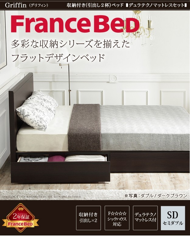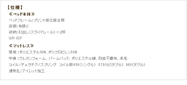 【!ご注文前に必ずご確認下さい!】●メーカー直送のため代金引換はお受けできません。●沖縄・一部離島は別途送料がかかります。お見積りいたしますのでお問い合わせ下さい。●商品サイズと設置場所、搬入経路のご確認をお願いいたします。●受注生産品のため、発注後のキャンセル及び変更はお受けできませんのでご了承ください。●安心のメーカー2年保証【セット構成】ベッドx1・マットレスx1【カラーバリエーション】ダークブラウン・ミディアムブラウン・ナチュラル【仕様】■ベッド本体:プリント紙化粧合板床板:布張り引出:スライドレール◎組立品■マットレス張地:ポリエステル50%、ポリプロピレン50%中身:ウレタンフォーム、パームパッド、ポリエステル綿、防虫不織布、羊毛コイル:デュラテクノスプリング・コイル数570【サイズ】■ベッド外寸:幅123x奥行200x高さ87cm/重量:約54kg床面高さ:22.5cm宮奥行:5cm引出内寸:幅86.5x奥行37x高さ11cm(x2杯)■マットレス外寸:幅122x奥行195x高さ23cm/重量:約23kg株式会社ナカムラ(I-4700228)