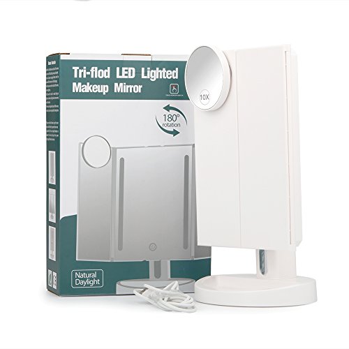 -. Feature : HASSLE FREE MAKEUP APPLICATION: Looking for led lighted and extremely easy ways to put on your makeup? If so, then this makeup mirror with lights and 10x magnification is an absolute must have gadget my ladies. Ideal for applying makeup, eyeshadows, contouring, plucking your eyebrows, shaving, beauty masks, moisturizers, and other facial treatments. / ENJOY SOFT, BRIGHT & NATURAL LIGHT: Designed with your best interest at heart, this light up vanity mirror is equipped with a 16pcs top graded efficient LED lighting system. Enjoy crystal clear view, natural light, and brilliant makeup environment which lasts for up to 10,000 hours. Enjoy a flawless and accurate makeup every time. / CONFORMS TO YOUR NEEDS: Thanks to its auto shut off, touch sensors and 180° free rotation mechanism, this trifold travel mirror conforms to all your needs. Fix it to any position you want to achieve the desired results. Its 10x magnifying round mirror is removable. Great for trips, vacations, and your purse. Makeup on the go has never been that easy before. / COMES ALONG WITH YOU: Being portable, compact and folding, this illuminated cosmetic mirror goes everywhere you go. Great for home use, office, car, and traveling of course. You can either operate it with 4 AA batteries or via its USB port for a more energy efficient use! It's all up to you! Facilitate your life and makeup application to the fullest. / GET THIS WHITE BEAUTY MIRROR RISK FREE: Since your satisfaction is our top P.R.Iority, this lighted vanity makeup mirror is backed by our unconditional 30-day money back guarantee policy. Just in case you don't simply love it. Makes a thoughtful gift to a dear friend or beloved family member! Forget about messy makeup and enjoy professional like results!